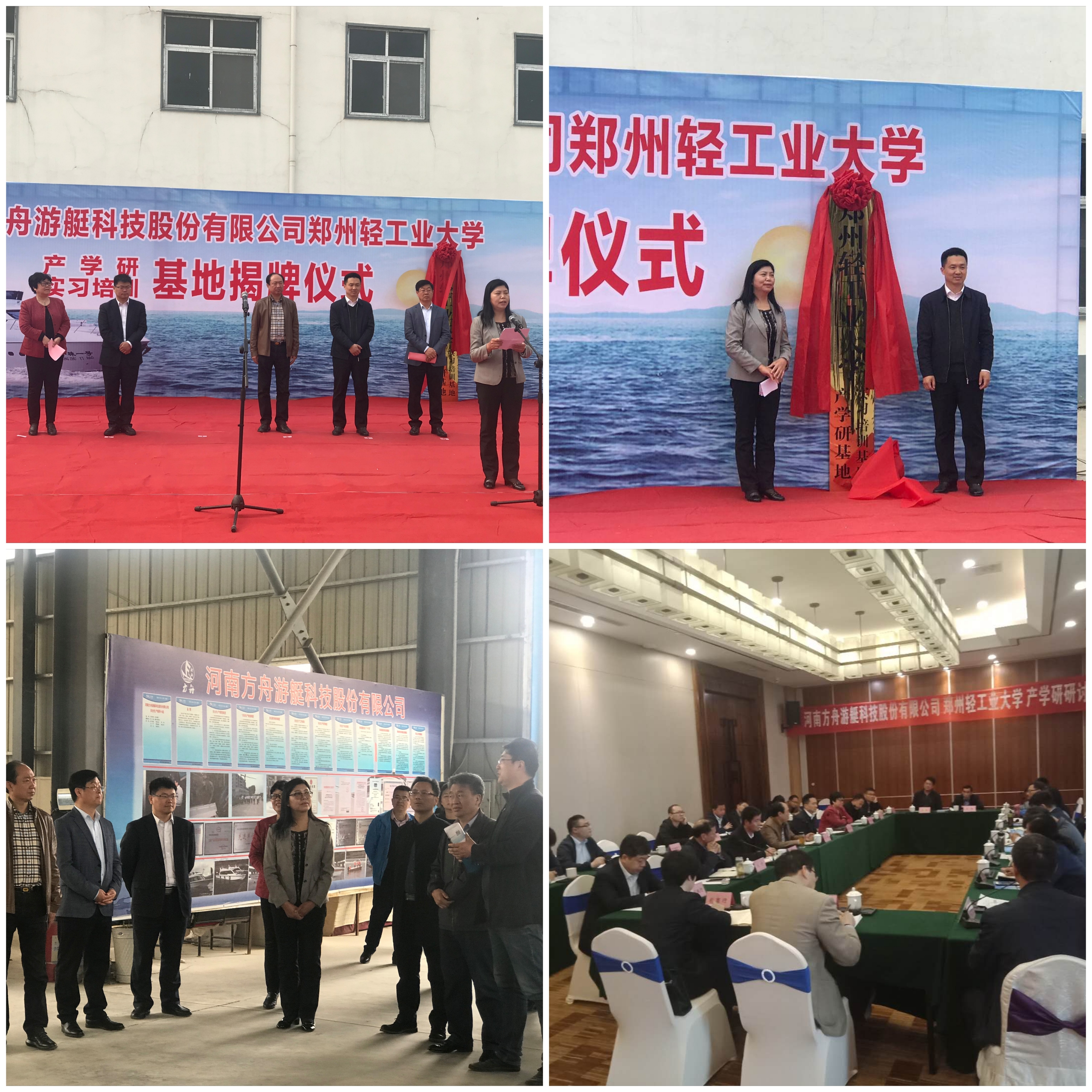 27日上午,在泌阳县产业集聚区河南方舟游艇科技股份有限公司,我校与该公司举行了产学研和实习培训基地校企合作揭牌仪式。驻马店市海事局局长许辉,泌阳县委常委、副县长朱晓东,县人大常委会副主任张宏超出席揭牌仪式,方舟游艇科技公司领导和职工,我校专家团队成员,以及泌阳县相关局委、各大银行负责人参加。揭牌仪式由张宏超副主任主持,许辉局长、朱晓东副县长分别代表驻马店市海事局和泌阳县委、县政府致辞祝贺,刘珂院长和方舟游艇科技公司董事长石凤春先后讲话,表示希望加强校企合作、实现互利共赢。揭牌仪式结束后,在市县领导和公司负责人的陪同下,团队成员深入企业考察了解生产设备、研发、产能、经营等实际情况。