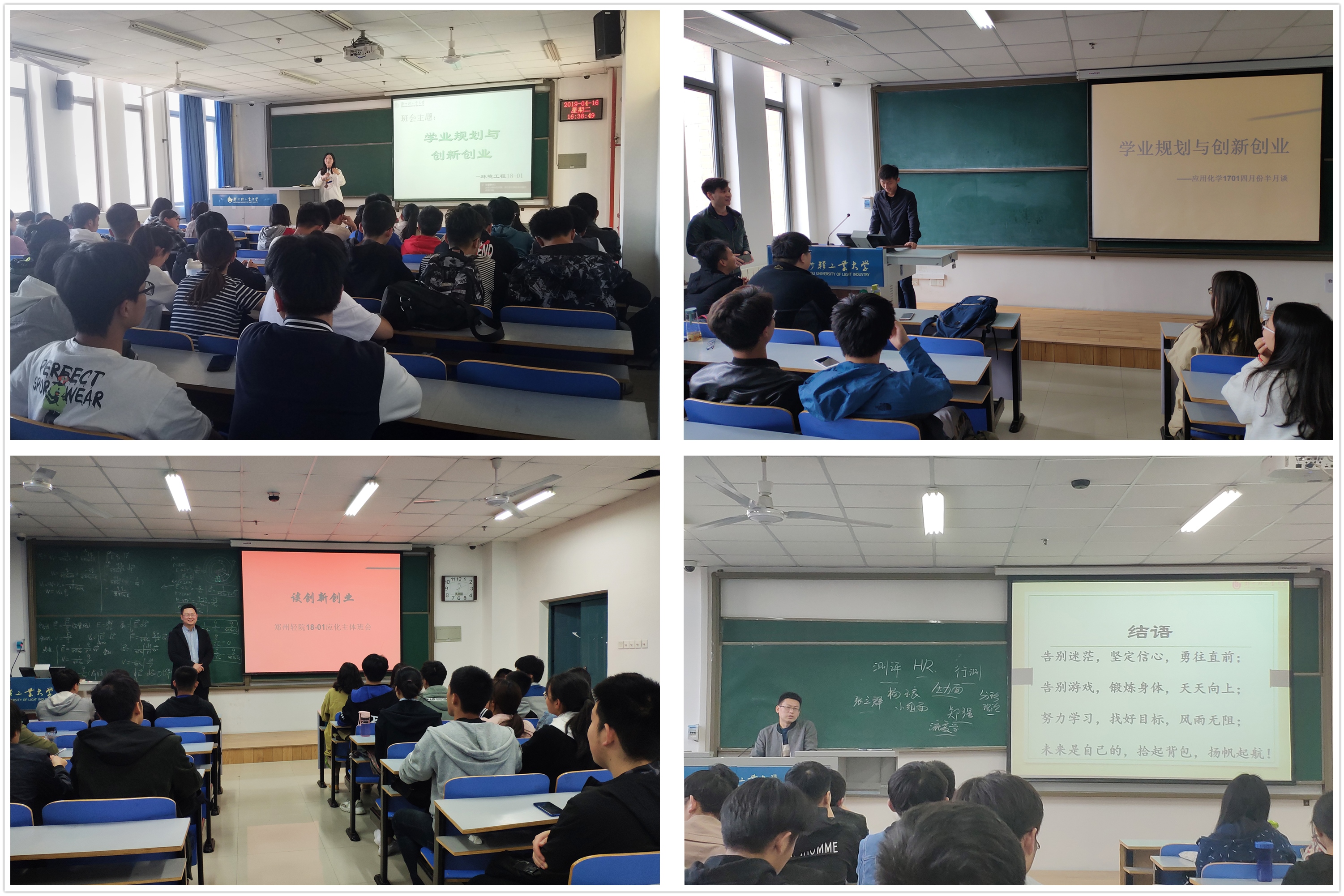 创新创业能力培养旨在激发和挖掘学生对创新创业的热情,从而使同学们了解社会上科技发展的新动态与创业的新契机,为今后的学习和创业指明前进方向。在新材器18-01班,班主任曹阳老师向同学们讲述了所学专业的特色、研究方向、发展前景,教育同学们勤于思考、找准方法、注重实践操作、积淀专业知识、夯实专业基础。在应用化学17-01班,班主任刘军伟老师开展“谈学业规划和谈创新创业”的主题班会,收集每位同学的学业规划并给出指导和建议。在环境工程18-01班,班主任王兰老师分析了环境工程专业的就业趋势和前景,鼓励学生参与到本专业老师的科研项目中,找到自己感兴趣的研究内容,把自己的理论知识应用到实际的科研实验中,带着科研实验中遇到的问题再回过头来有目的地学习理论知识,让学习变得有趣。应用化学18-01班的班主任郭会师老师、高分子16-01班的陈荣源老师就创业计划竞赛、创业项目的选择等,针对不同年级的特点给出了切合实际的意见。
