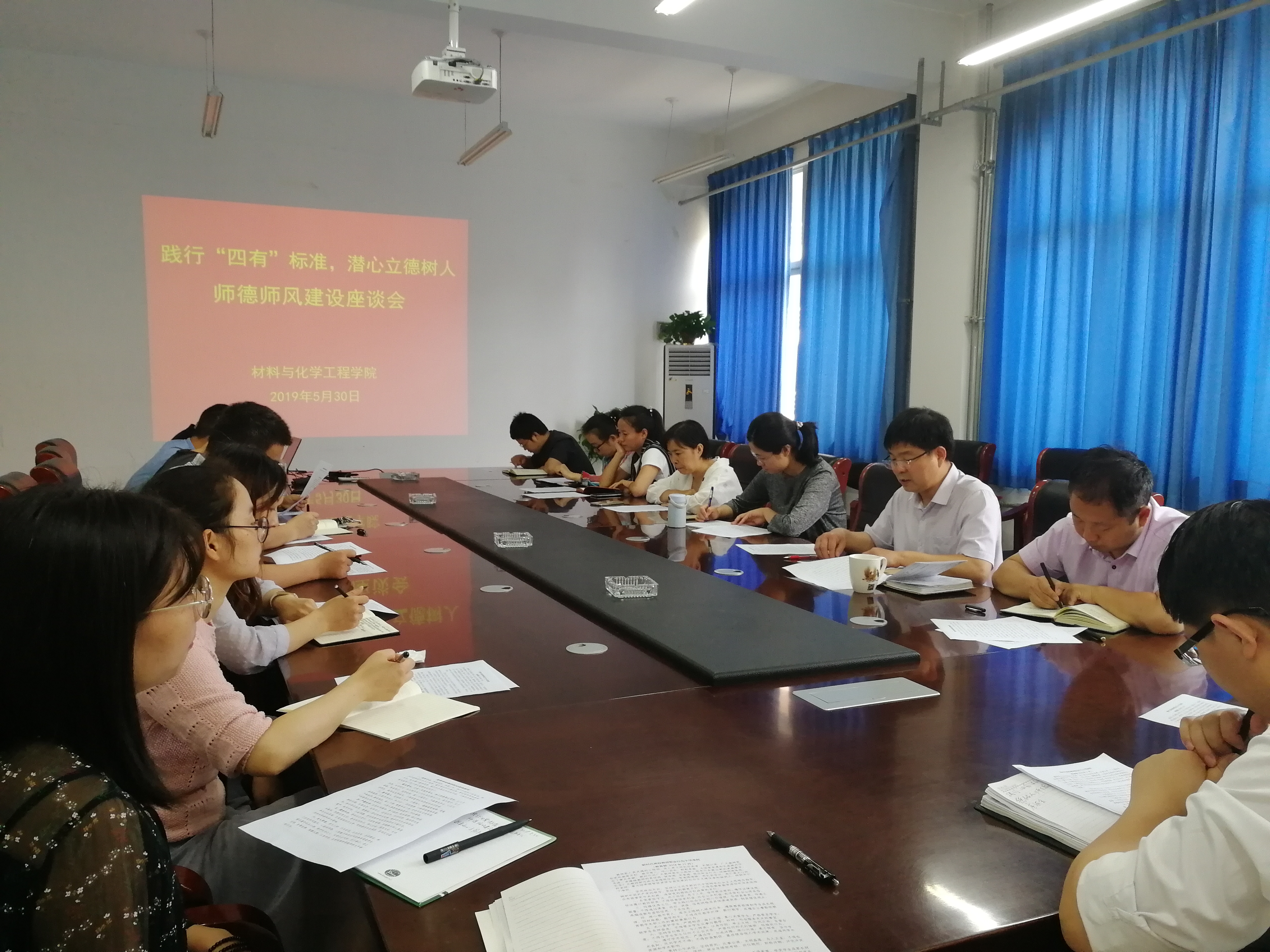5月30日上午,材料与化学工程学院召开“践行‘四有’标准,潜心立德树人”师德师风建设座谈会。学院各基层单位教师代表参加座谈会,学院党总支书记康国磊参加会议并围绕立德树人根本任务和师德师风建设作思想政治学习辅导,会议由学院党总支副书记宋德涛主持。