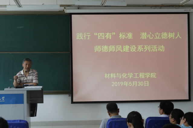 为了深化“文明校园”创建工作,建设“有理想信念、有道德情操、有扎实学识、有仁爱之心”的教师队伍,材料与化学工程学院5月30日开展了“践行‘四有’标准,潜心立德树人”为主题的“师说师德师风”学习教育活动。此次学习教育活动由省文明教师获得者韩周祥老师为全院教职工作者作“站好三尺讲台,潜心教书育人”的经验交流报告。