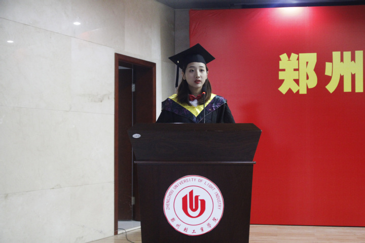 上午9时,毕业典礼在雄壮的国歌声中拉开帷幕。吴诗德副院长宣读了授予硕士学位名单,尹志刚副院长宣读了授予学士学位及准予毕业本科生名单。我校2019届“十佳毕业生”李飞翰同学代表毕业生发言,她总结了四年来学到的知识与技能,深切表达对学院领导、老师的感激之情,以及即将踏入社会、迈向新征程的坚定信心。