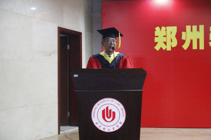周立明院长代表学院致辞,他向所有圆满完成学业的毕业生表示祝贺,也为各位毕业生所获得的成长感到欣喜和骄傲。他说,同学们在校学习生活的四年,正是学院发展的关键时期。同学们亲历并参与了更名大学、本科教育审核评估、博士单位建设等重大工作,共同见证了母校迈向建设高水平轻工业大学的新征程。四年里,2015级学生在专业学习、课外科技活动、创新创业等方面都取得了优异的成绩,涌现出许多先进典型。经过四年的学习,2015级同学整体就业形势良好,特别是有119名同学考取研究生,考研率达到32%,有的专业达到40%,实现新的突破。最后,周院长对毕业生同学寄予了四点希望:第一,牢记校训,传承文化;第二,终身学习,追求真理;第三,艰苦创业,自强不息;第四,报效祖国,热爱母校。