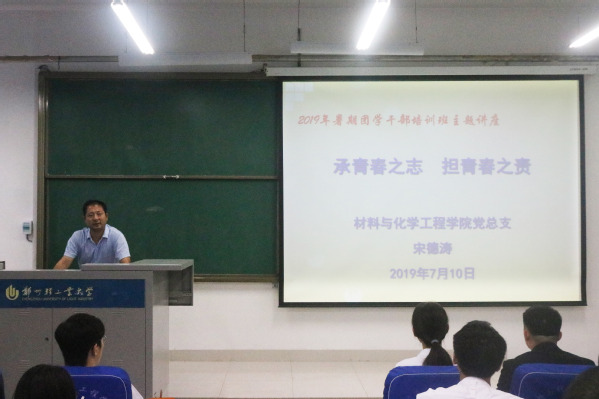 7月10日至11日,材料与化学工程学院在化工楼召开“牢记使命,勇担责任”2019年暑期团学骨干培训班。学院党总支副书记宋德涛,分团委副书记赵梦婕,2017级、2018级团学骨干参与本次培训。