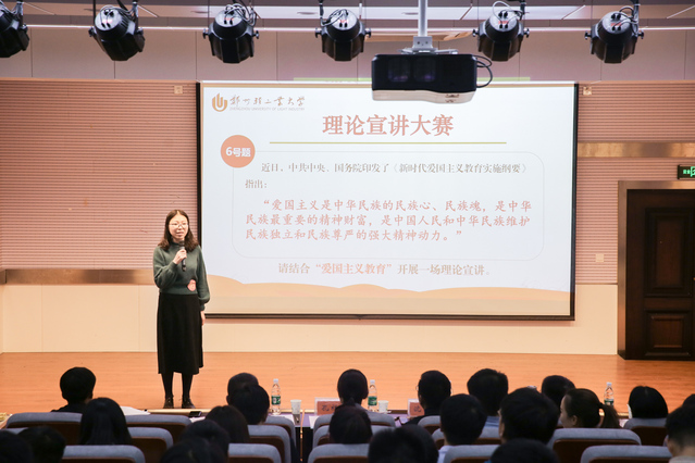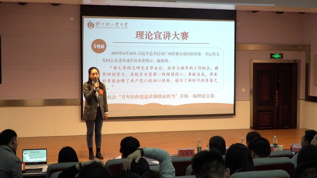 理论宣讲大赛主要考察参赛选手对马克思主义理论、习近平新时代中国特色社会主义思想、党的十九大精神、全国高校思想政治工作会议、全国教育大会和学校思想政治理论课教师座谈会精神等方面的学习宣传阐释能力,以及开展大学生理想信念教育、中国特色社会主义和中国梦宣传教育、社会主义核心价值观教育过程中的理论阐释能力,注重理论宣讲的政治性、理论性、政策性、导向性。参赛选手采用抽题的形式确定宣讲主题,宣讲时间限时5分钟。