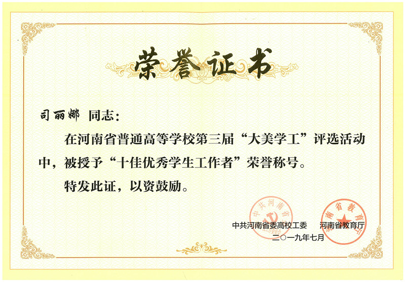 (2)“大美学工”十佳优秀学生工作者——计算机与通信工程学院辅导员司丽娜:2005年起从事辅导员工作,累计担任33个班2000多名学生的辅导员,她设立“娜young说”时间,坚持每周与同学倾心交流,累计1000多个小时;设计并推行《大学生职业学业规划手册》,通过精细化、针对性、全覆盖的深度辅导,指导学生成长;依托大学生党员工作室,推行大学生党员发展教育精细化模式,深化基础党建,凝聚青春力量。14年来,她先后获得河南省高等学校优秀党务工作者、河南省高等学校思想政治工作优秀品牌、河南省辅导员优秀论文一等奖等荣誉和奖励。