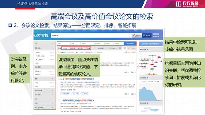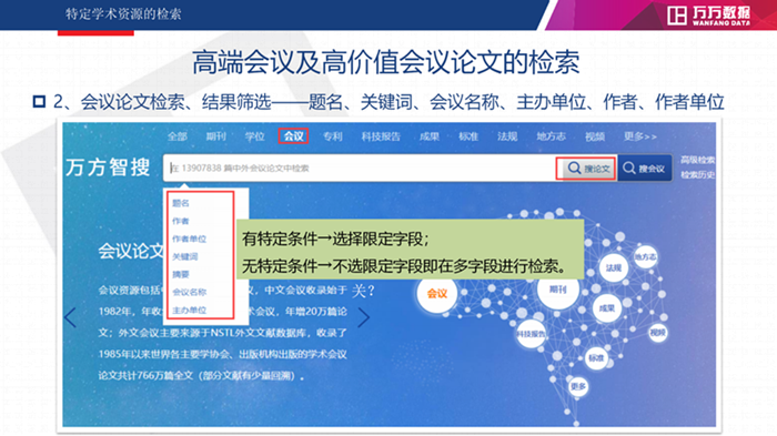 在万方知识服务平台上,我们可以用通过导航浏览和检索浏览的方式来查找优质的会议及高价值会议论文。这是会议的导航页,页面上部实时更新着近期的会议信息,方便大家集中浏览,可以掌握近期各组织和协会举办会议的情况。