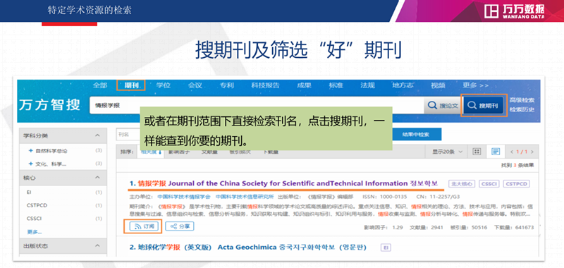 在期刊导航页面,我们选择自己研究的学科领域,页面右侧可以筛选核心收录、出版周期等,下方的排序可以切换影响因子排序、被引次数排序来筛选该领域内的影响因子高,被引次数高的优质期刊。如果你有了导师推荐的期刊,已经有要查找的特定期刊,可以在页面右方检索框直接检索期刊名称搜索。例如情报学报,可以在输入框内输入“情报学报”检索。