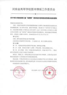 在第25个世界读书日到来之际,为助力师生阅读能力的提升,建设书香校园,推动全民阅读活动持续健康发展,河南省高等学校图书情报工作委员会联合同方知网(北京)技术有限公司河南分公司共同开展第三届“知网杯”高校知识发现有奖竞赛活动。