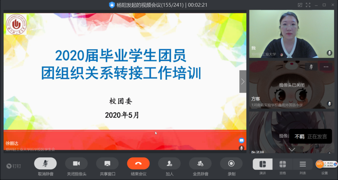 为深入推进共青团改革,有效提升我校各级团组织的团务工作效率和业务水平,加强基层团组织规范化建设,切实做好“智慧团建”学社衔接、团组织整顿等重点工作,5月24日上午,校团委利用钉钉直播召开了郑州轻工业大学2020届毕业学生团员团组织关系转接工作线上培训会议,校团委负责老师、各学院负责老师、学生团干及2020届毕业班团支部书记近300人参加了本次培训。