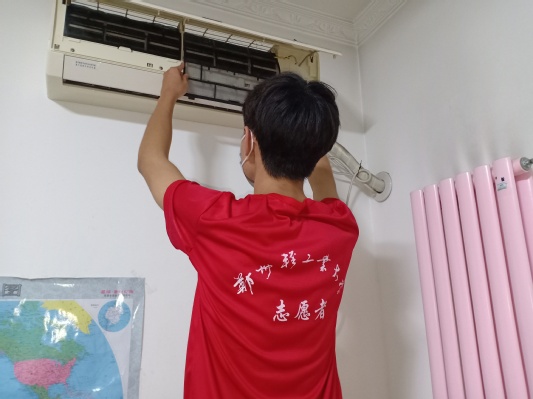 畅享健康生活,志愿服务居民。为了更好地服务社区居民,志愿者们在社区工作人员的引导下来到居民家中开始义务清洗空调。队员边帮助他们清洁空调滤网,边认真地向他们讲解了空调节电使用小窍门,并积极进行节电节能宣传。大家为大学生主动服务群众的行为点赞,为表示感谢,居民都非常热情地拿出水果和纯净水来招待志愿者。