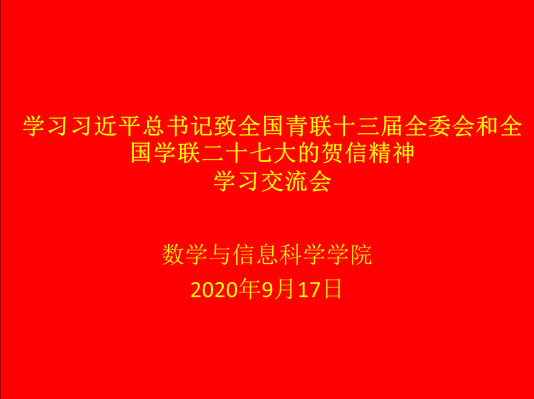 为深入学习贯彻习近平总书记致全国青联十三届全委会和全国学联二十七大的贺信精神,激励广大青年坚定理想信念,练就过硬本领,9月17日,数学与信息科学学院通过线上和线下集中学习传达了全国青联十三届全委会和全国学联二十七大会议精神。