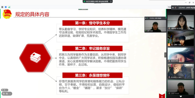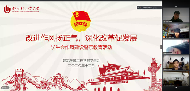 为持续深化学生会工作人员服务意识,进一步加强学生会作风建设,塑造清新组织形象,12月5日晚,建筑环境工程学院在科学校区及禹州实习实训基地开展“改进作风扬正气,深化改革促发展”学生会作风建设线上警示教育活动。学院团委书记寇誉元及全体学生会成员参加此次会议,会议由学院学生会主席团成员车磊主持。