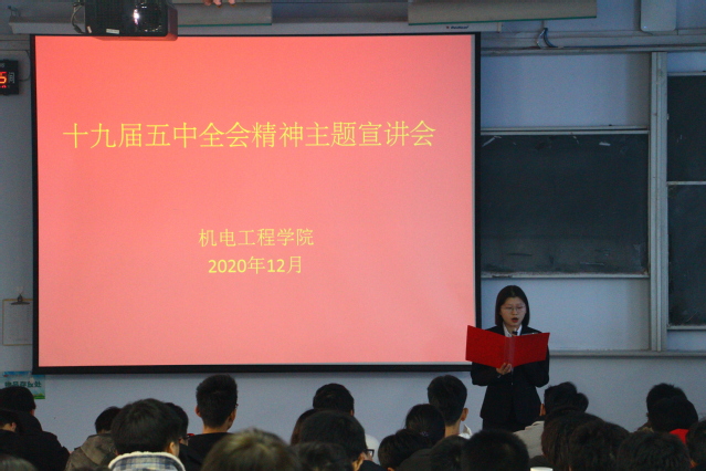 为深入学习贯彻党的十九届五中全会精神,增强团员青年的政治自觉和思想自觉,机电工程学院于12月10日在东一楼200举办党的十九届五中全会精神宣讲会。本次活动邀请校青年讲师团成员矫菲老师担任主讲,我院全体团学骨干、青马培训班学员参加了此次宣讲会。