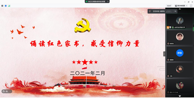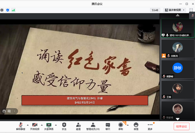在本次活动中,同学们以音频、视频的形式接力诵读革命烈士的家书,并结合自己的学习、生活实际,把所思所想所得在线上与大家分享交流。他们或情真意切,或娓娓道来,沉浸在追忆前辈事迹、感悟先烈初心、传递家国情怀之中。品读红色家书,与先烈们展开心灵对话,不仅使同学们感受到什么是个人家庭的小爱,更能体会到什么是民族革命的大义、什么是先烈的忠诚担当。广大同学通过学家书、诵家书、议家书、悟家书,从红色家书中重温革命历史、缅怀革命先烈、传承红色基因,深切感受了革命烈士的理想信念和家国情怀,从红色家书中获取信仰的力量,不忘初心跟党走,牢记使命勇担当。