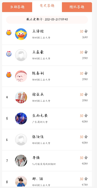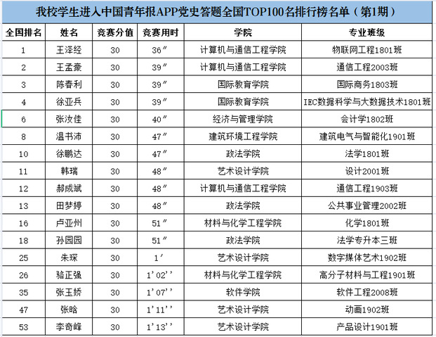 根据校团委《关于开展“学党史 强信念 跟党走”庆祝建党100周年网上党史知识竞赛的通知》的要求,学生通过中国青年报APP客户端或团中央“一起学党史”网上答题小程序参与网上党史知识竞答,截止到/截至到3月21日,在中国青年报APP客户端第一期党史知识竞答中,我校有20名同学进入全国TOP100榜单,现将已经核实的学生名单公布如下: