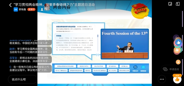 为深入学习贯彻全国两会精神,3月12日至3月23日,国际教育学院组织开展了“学习贯彻两会精神,凝聚青春磅礴之力”为主题的团日活动。学院各年级以团支部为单位参加了此次活动。