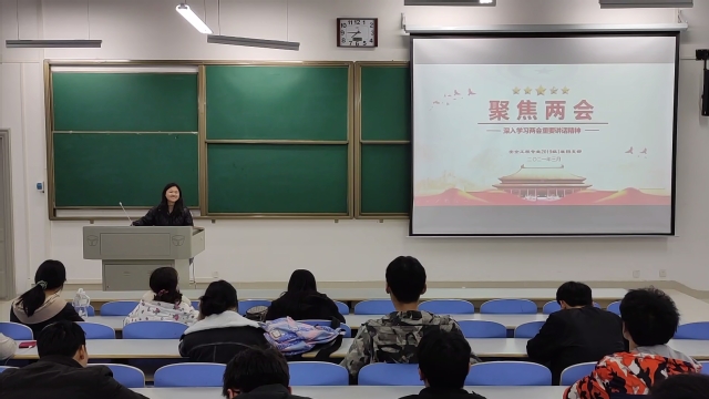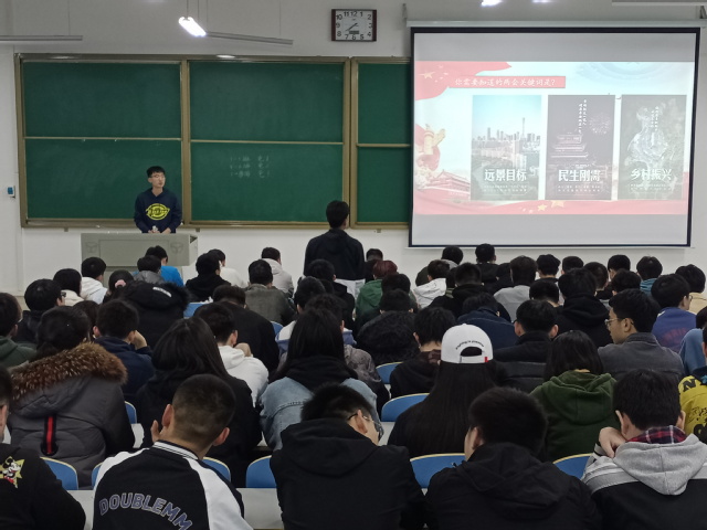 各班级团支部通过观看两会开幕式、PPT讲解、学习研讨等方式了解两会内容,学习两会精神,并围绕教育、就业、创业、抗疫等问题谈认识、说感想,进行热烈讨论。他们或是以寝室为单位,推出各位代表展示他们的学习成果,分享他们对两会精神的认识与感悟;或是集体朗读入团誓词,使同学们重温入团的初心和使命;或是通过观看视频,重点学习探讨“两会”中的教育问题及创业问题;或是针对两会关键词“健康中国”,讲述疫情防控取得的重大成果及先进人物,引起同学们强烈的共鸣与讨论。大家纷纷表示,要时刻关注国家发展,把握社会动向,以习近平新时代中国特色社会主义思想为指引,树立远大理想,学习文化知识,提高实践能力,努力成长为担当民族复兴大任的时代新人。