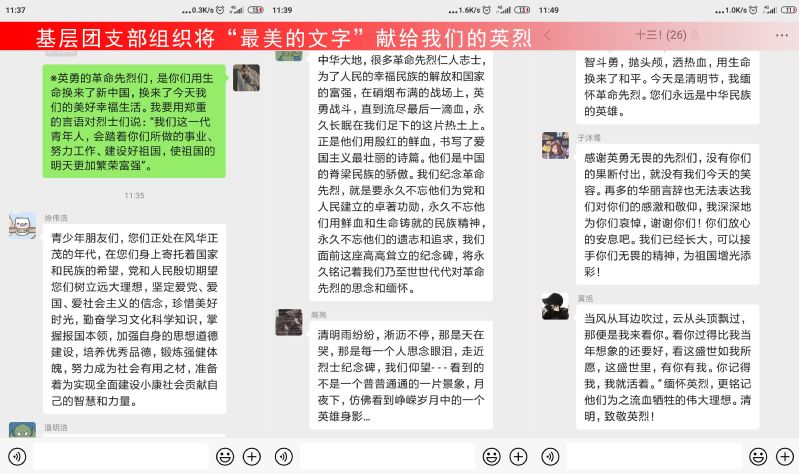 活动从缅怀先烈、纪念抗疫中牺牲的英雄、网上献花、网上留言寄语、分享感悟等多方面开展。各班团支部书记通过线上屏幕分享的方式带领班级同学们观看了缅怀先烈的相关视频,学习了烈士们的爱国英雄事迹。随后,班级同学们进行了网上献花、网上留言寄语等多种祭祀活动,向逝去的英烈们致敬。最后,大家线上分享了自己的学习英雄事迹的感悟。