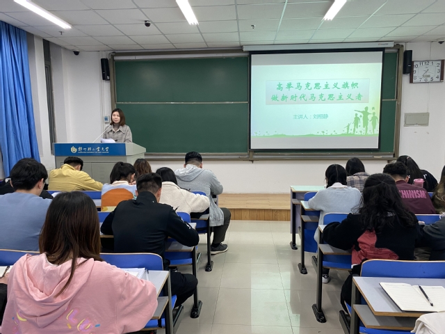 刘老师从“青马工程”的概念、来源、做新时代的青年马克思主义者等几方面展开讲解。首先,刘老师为同学们系统讲解了什么是“青马工程”以及“青马工程”的起源和发展过程,围绕“信仰坚定、能力突出、素质优良、作风过硬”等要素详细阐述了青年政治人才必备条件。接着,刘老师从人才是事业的根本保证、共青团的根本任务和政治责任、新时代的青年特点作为切入点,讲解了“青马工程”的来源。最后,刘老师结合习近平总书记对青年一代的殷殷嘱托,希望同学们高举马克思主义伟大旗帜,做有家国情怀、有理想、有担当、有本领的新时代马克思主义者,