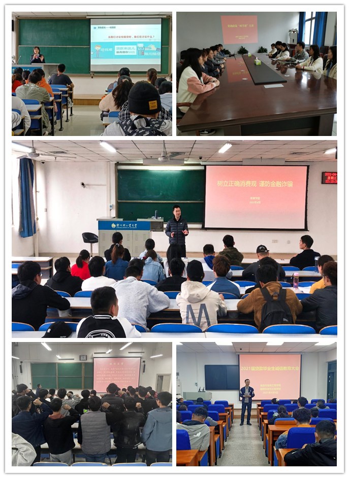 学校通过“两微一抖”、学工移动平台等多渠道、全方位向全体学生发布有关不良网贷的最新预警提示信息。组织各学院开展校园贷风险防范专项教育和不良校园网贷摸排工作。政法学院邀请专家进行防范“校园贷”讲座,能源与动力工程学院、食品与生物工程学院开展诚信教育和宣誓活动,机电工程学院、体育学院等举办了“拒绝不良网贷”的主题班会。一直以来,学校通过校园卡消费大数据、走访座谈等方式,密切关注学生异常消费行为,完善临时困难补助机制,多措并举开展资助政策宣传,教育引导学生在出现经济困难时要通过国家助学贷款、国家助学金及校内资助等正当合法途径来解决。近期,学校深入实施学生发展性资助成长计划项目,支持学生开展拓展学习、创新创业等,满足学生发展性需求,切实提高资助育人实效。