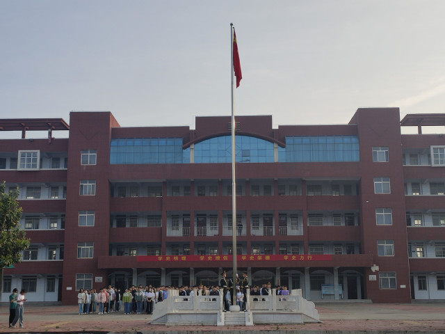 清晨6:40分,伴随着《义勇军进行曲》,国旗护卫队队员迈着铿锵有力的步伐,护卫五星红旗入场,全体师生满怀敬意地注视着鲜艳的五星红旗冉冉升起,随风飘扬。