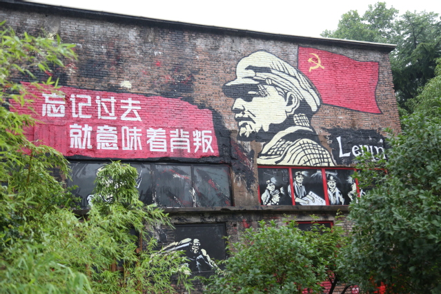 在西大井文旅集团副总宋宏亮带领下,队员们进入了园区,宋总经理先带领队员来到英国福公司坑口电厂遗址,这里还有煤矿工人下井时乘坐的罐笼。井架入口处墙上的“工业学大庆”“安全生产”字样仍清晰可见,院内残存的雕塑、凉亭、露天游泳池等仿佛在告诉人们,昔日这个拥有五六千名矿工的大矿的红火与辉煌。队员们看到这面“忘记过去就意味着背叛”饱经历史沧桑的红砖墙,深深地记住了王封矿—这座煤矿工业发展的“活化石”,西大井是焦作煤矿“特别能战斗”精神的发源地,是焦作工人运动的发祥地,更是中国产业工人“特别能战斗”的精神标识。