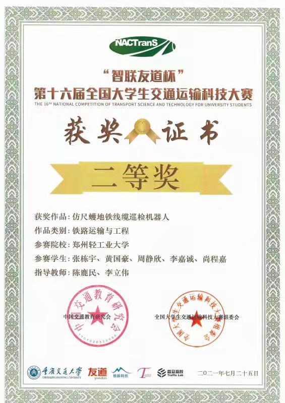1 | 铁路运输与工程 | 张栋宇 | 测控19-01 | 541902030127 | 陈鹿民 李立伟 | 二等奖 |