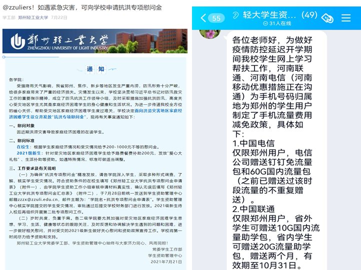 面对汛情和疫情的双重考验,学校启动应急资助,第一时间发布了《关于向洪涝灾害地区家庭经济困难学生发放抗洪专项慰问金的通知》,开通汛期资助救助热线,设立“抗洪专项慰问金”。各学院全面开展对受灾学生的排查工作,广大学工干部、全体辅导员老师通过微信、QQ、电话等形式,“一对一”对省内学生进行“云”家访,建立受灾严重地区学生信息台账,为851名受灾学生发放39.67万抗洪专项救助金,确保“摸排全覆盖、关爱及时到”。秋季学期开学后,学校将为受洪涝灾害影响严重的家庭经济困难学生提供最高档资助,通过“六位一体”资助政策体系为受灾学子筑起抗汛救灾的“资助堤坝”。此外,学生资助管理中心主动对接河南移动、河南联通、河南电信对学生网络学习流量进行补贴,助力保障“停课不停学”。