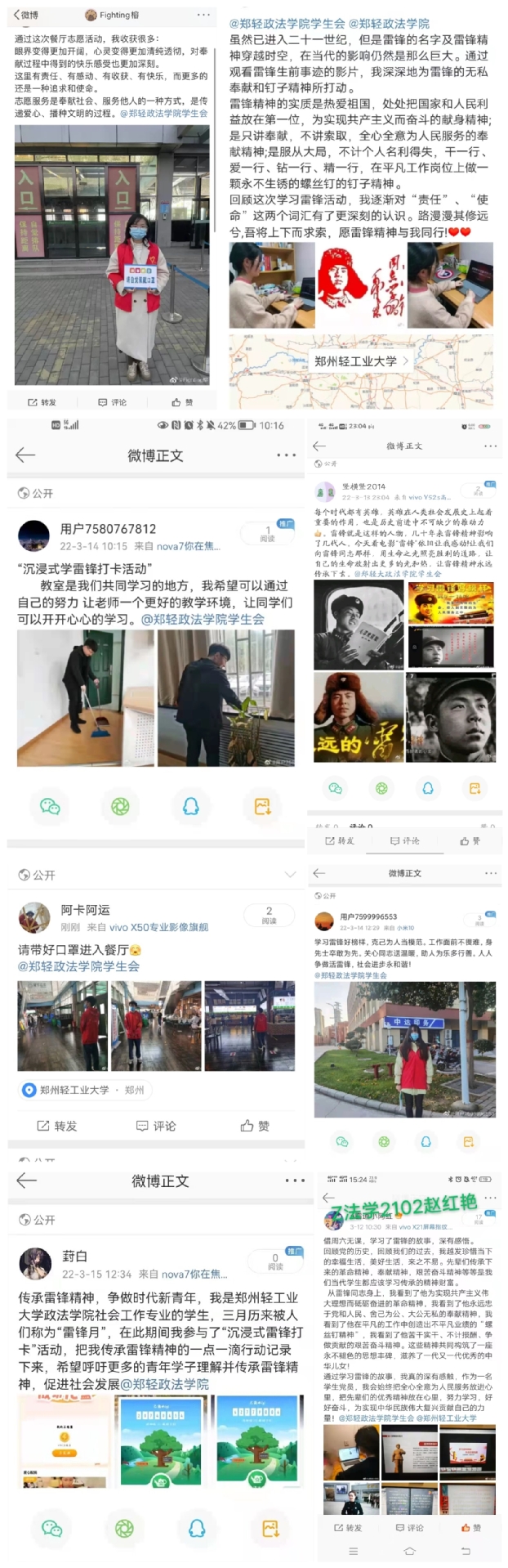 政法学子切实践行“学习雷锋、奉献他人、体现价值”的志愿者精神,开展美好生活、关爱自然、疫情防控等形式多样的志愿服务活动,并拍照记录后通过微博打卡的形式参与活动。公管2101班带领同学参与环保宣传、绿色低碳实践等关爱自然志愿服务活动;法学2101班组织同学们开展校园义务普法,营造良好校园法治氛围;社工2001班组织动员大家参与线上植绿、蚂蚁森林认养绿地等活动;公管1901班组织志愿者积极参与防疫宣传和督导,在教室、餐厅、宿舍、图书馆等场所提醒同学们戴口罩,做好个人防护。同学们广泛参与,积极进行微博打卡展示,字里行间洋溢着助人为乐的快乐,通过活动让同学们感受到雷锋精神距离我们并不遥远,就在我们身边。