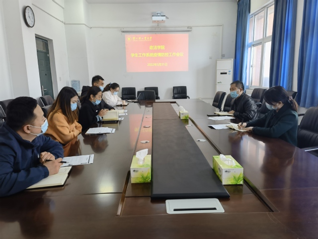 3月31日上午,政法学院在政法楼212会议室召开学生工作系统疫情防控工作会,学院党委书记宋德涛和全体专兼职辅导员参加了会议。