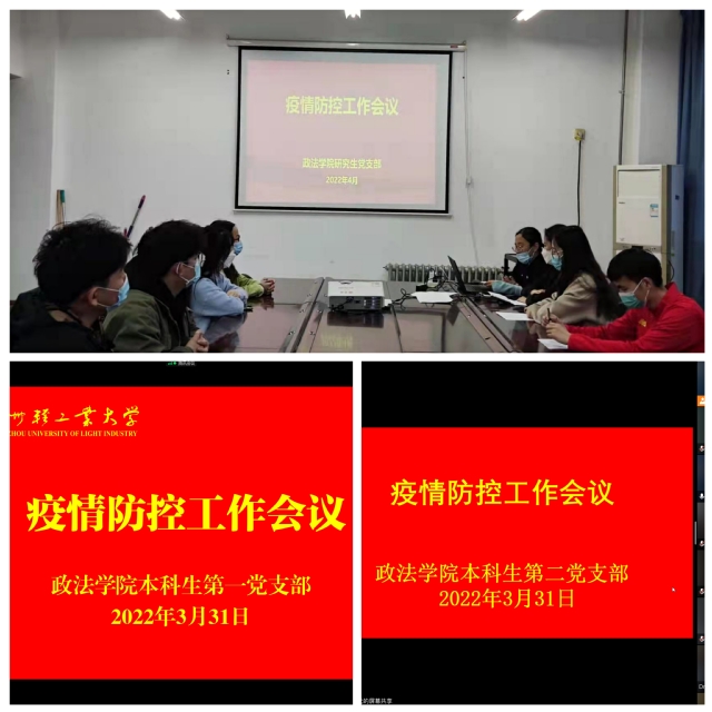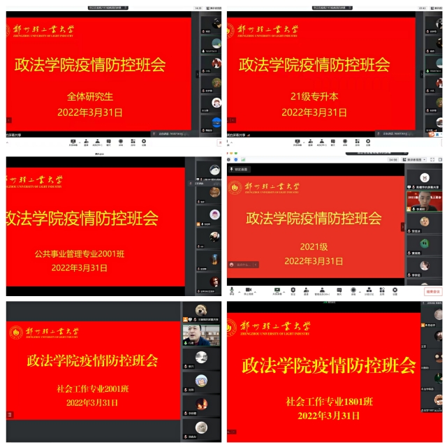 3月31日-4月1日,政法学院各班级分别召开疫情防控主题线上班会。辅导员带领同学们认真学习省教育厅和学校疫情防控最新政策,针对当前疫情防控严峻形势,引导同学们积极关注当前疫情防控动态,为同学们讲明学校疫情防控工作要求,让每一位同学了解并掌握疫情防控知识和学校最新防控要求,明确认识到当前疫情的严峻形势,并要求同学们做好疫情防控第一责任人。面对即将到来的清明节假期,要求学生遵规守纪教育,严格遵守地方政府和学校各项防疫规定,非必要不外出,坚持每日健康打卡,按时参加核酸检测。坚决做到不信谣,不传谣,不发布虚假信息,并给同学们及时传达有关不遵守疫情防控规定产生严重后果的案例。会后,每位同学认真学习并签订了《郑州轻工业大学学生疫情防控承诺书》。
