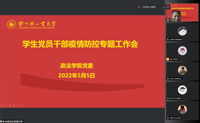 为深入贯彻学校党委关于疫情防控工作的具体要求,打赢疫情防控阻击战,5月5日中午,政法学院通过腾讯会议的方式召开学生党员干部疫情防控专题工作会,会议由学院党委书记宋德涛主持,全体辅导员、学生党员、学生干部、寝室长参加了此次会议。
