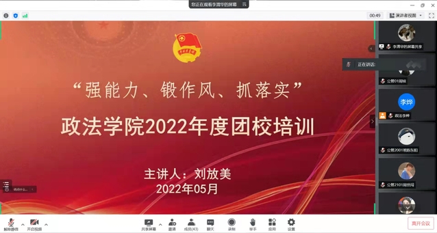 为进一步加强理想信念教育,提升团学骨干的综合素质和水平,近日,政法学院在线上开展“强能力、锻作风、抓落实”专题团校培训第二讲,学院党委副书记刘放美担任主讲,全体团学骨干参加了培训。