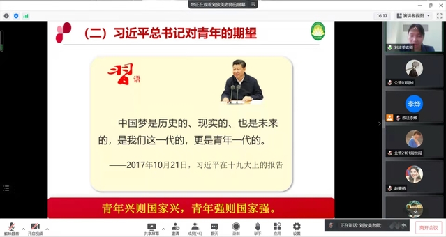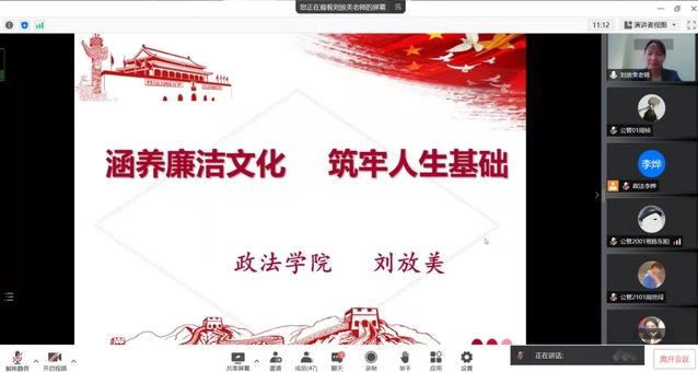 课程伊始,刘书记介绍了团课培训的重要意义,接着围绕“涵养廉洁文化,筑牢人生基础”这一主题,从“习近平总书记对青年的期望”“腐败的危害和影响”“廉洁文化的精髓”“学生干部争做践行廉洁价值观的典范”这四个方面展开讲解。刘书记强调,团学工作要紧扣习近平总书记关于青年工作的重要论述和关于共青团工作的重要指示来展开,把“强能力、锻作风、抓落实”的工作基调贯彻落实到日常工作中去,用好各类学习、培训平台,不断强化理论武装,提升政治能力,转变工作作风,做到信念过硬、政治过硬、责任过硬、能力过硬、作风过硬。最后,全体师生线上观看了相关纪录片。