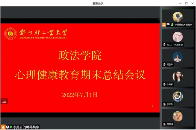 7月1日,政法学院召开心理健康教育工作期末总结线上会议,学院党委副书记刘放美、心理专职老师李昊轩、心理部成员及各班心理委员参加本次会议,会议由李昊轩老师主持。