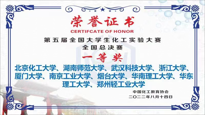 8月10日至14日,2022“欧 尔·东方仿真”杯第五届全国大学生化工实验大赛总决赛在四川大学举办。由我校材料与化学工程学院应用化学专业2019级学生胡亚婷、尹铭铭和化学工程与工艺专业2019级学生徐豪杰组成的郑州轻工业大学“激流勇进”代表队,材料与化学工程学院化工原理教学中心蔡立芳主任、李皓老师和杨玄宇老师组成的指导团队,在2022“欧 尔·东方仿真”杯第五届全国大学生化工实验大赛总决赛中,经过激烈的角逐,喜获全国一等奖。