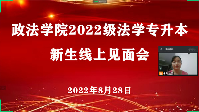 8月28日下午,政法学院召开2022级法学专升本新生线上见面会,学院党委副书记刘放美、团委书记刘栩静、学工办副主任栗想和全体2022级法学专升本新生参加了此次线上见面会。