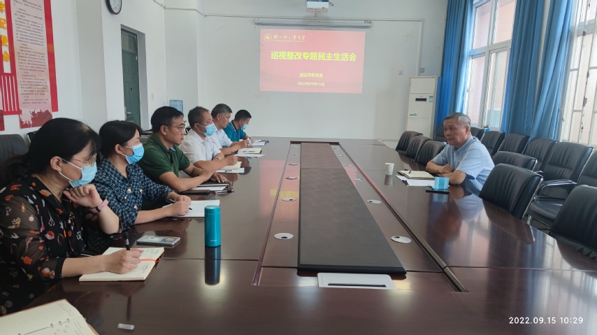 9月15日上午,政法学院党委召开巡视整改专题民主生活会。副校长苏东民到会指导,政法学院班子成员、社会发展研究中心领导干部参加,民主生活会由学院党委书记宋德涛主持。