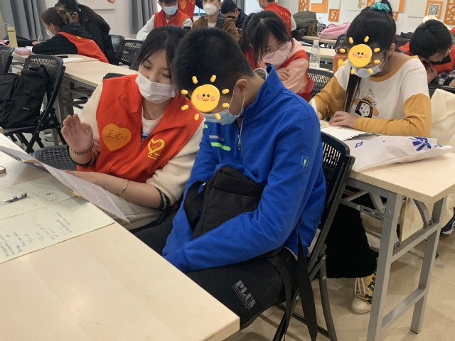 正式活动开始前1个小时,17名“小青心”全部就位,在社工老师的指导下为下午活动的开展做充分的准备。随着服务对象们的陆续到来,气氛逐渐热烈。本次活动有新加入的服务对象,“小青心”们积极和家长沟通,为孩子们提供最合适的成长陪伴。“共学营”正式开始,结对的小伙伴们共同探讨学习之前约定好的内容。第二项活动“我相信我可以”自信心提升小组活动是针对这群大龄心智障碍儿童群体特别开展的专业小组,本周是第一节活动。本节活动旨在引导这群孩子去认识自身的优点和具备的长处,调整孩子们的认知,增强他们的自信心和内在动力。