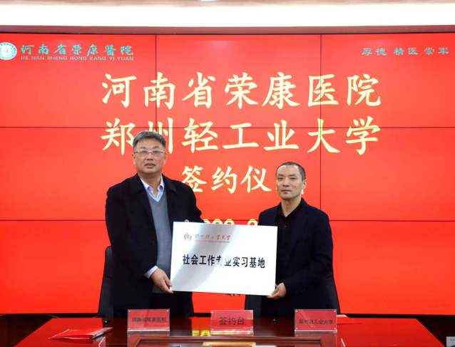 首先,河南省荣康医院党委书记、院长尤东坡详细介绍了医院的基本情况、发展定位和人才需求状况,希望双方进一步加强合作,发挥高校专业优势,提高社会工作人才的实务能力,促进医务社会工作的全面发展。栗志强副院长对多年来荣康医院在协同郑州轻工业大学培养社工人才方面所做的贡献表示诚挚的感谢,详细介绍了政法学院教学科研和人才培养的基本情况,希望借助此次签约契机,依托各自优势资源,进一步加强在人才培养、科研、毕业生就业等方面的深度合作,共谋发展。双方围绕"校、社"合作项目深入座谈交流,就推动实习基地建设、教学科研合作、就业创业等工作达成共识。随后,尤东坡院长和栗志强副院长分别代表荣康医院和政法学院在合作协议上签字并为社会工作专业实习基地揭牌。