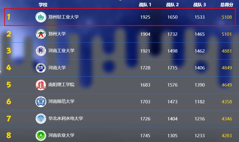 郑州轻工业大学的“为之则易,不为则难”代表队获得全国一等奖,勇夺河南省冠军团队荣誉;”猫猫的慕课作业要截止了”代表队获得全国二等奖;“深渊的潮声!”代表队获得全国三等奖。我校最终以总积分5108分在全国参赛高校中,位列第61名,再次获得该项赛事的河南省冠军高校的荣誉。