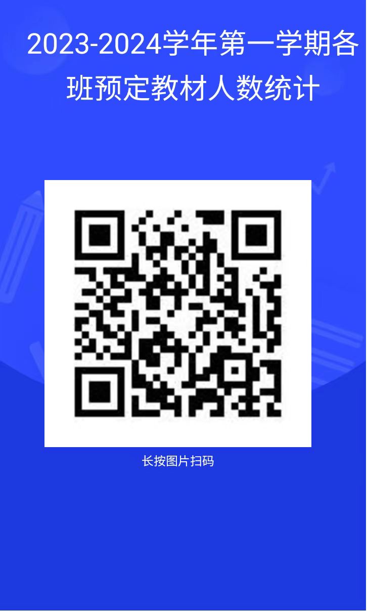 1.依据学校下学期教学任务安排情况,2020级、2021级、2022级本科生及2022级专升本各专业班级于本学期第十五周周三(5月24日)开始预报下学期教材使用人数。各专业班级负责人通过网址链接https://www.wjx.top/vm/e9AxIRF.aspx或扫描二维码(具体见通知下方),于第十六周周五(6月2日)17:30前,填写本班预订教材人数等相关信息。