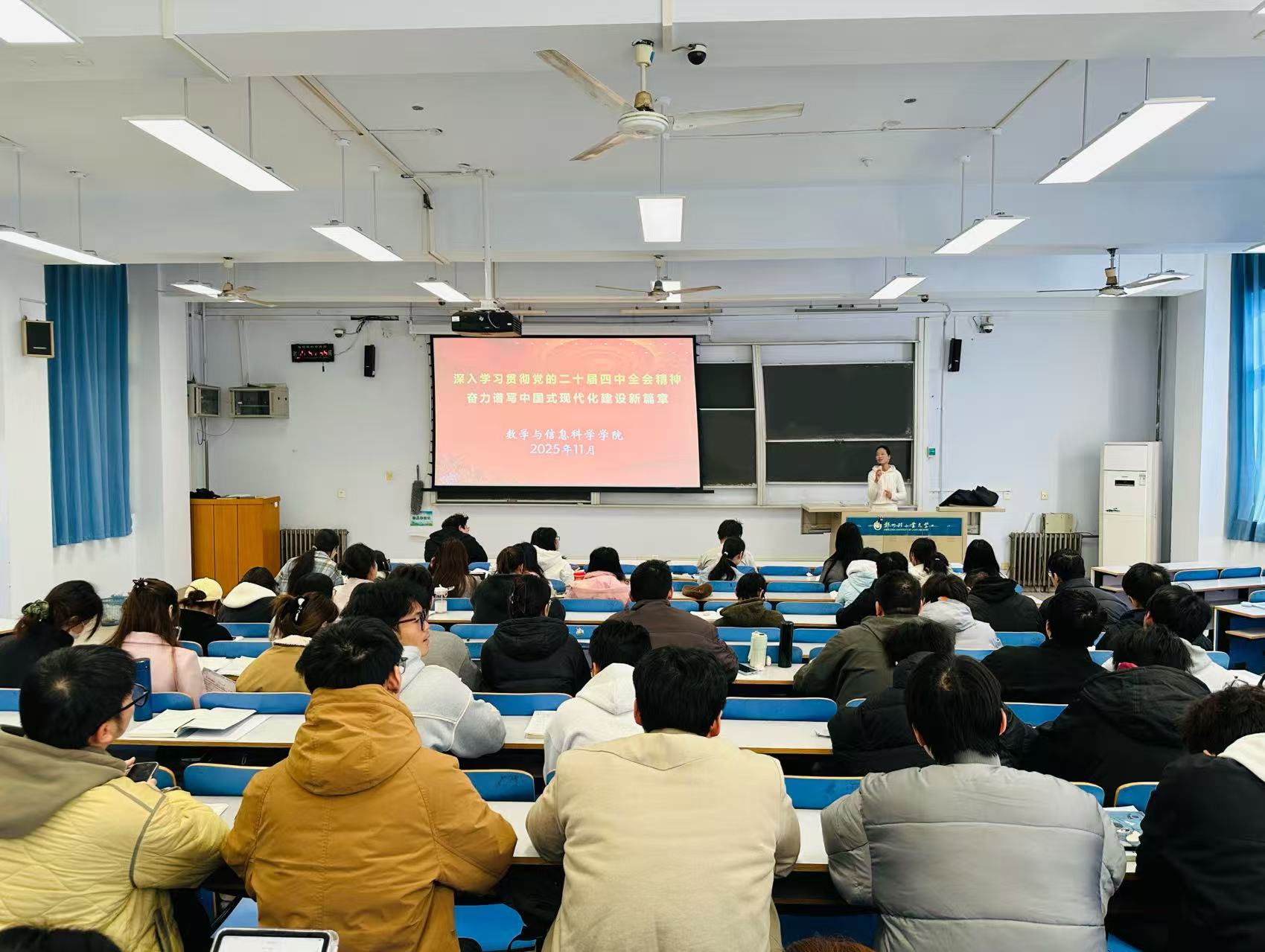 为全面准确学习领会党的二十届四中全会精神,引导广大青年学子把思想和行动统一到党中央决策部署上来,11月24日,数学与信息科学学院举行了“深入学习贯彻党的二十届四中全会精神 奋力谱写中国式现代化建设新篇章”宣讲会。本次宣讲由校青年讲师团成员、学院团委书记张智勤主讲,学院学生会全体工作人员、青马班学员参与学习。