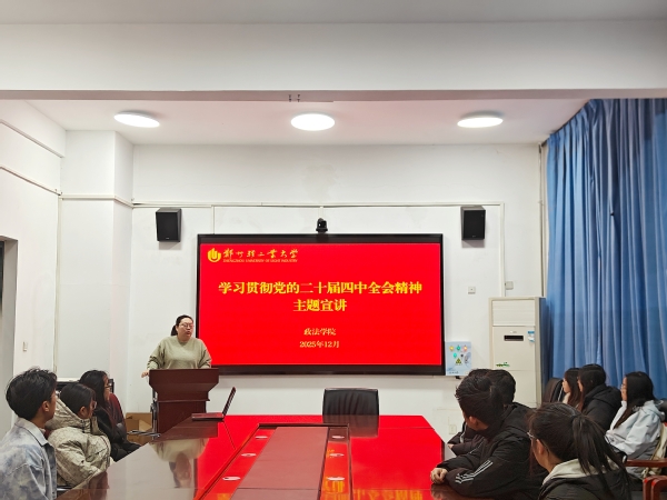 为深入引导学生深刻把握党的二十届四中全会精神的核心要义与要求,12月5日,政法学院在政法楼212会议室组织开展了学习贯彻党的二十届四中全会精神主题宣讲,校青年讲师团成员、政法学院团委书记栗想主讲,各年级团学骨干代表参加了学习。