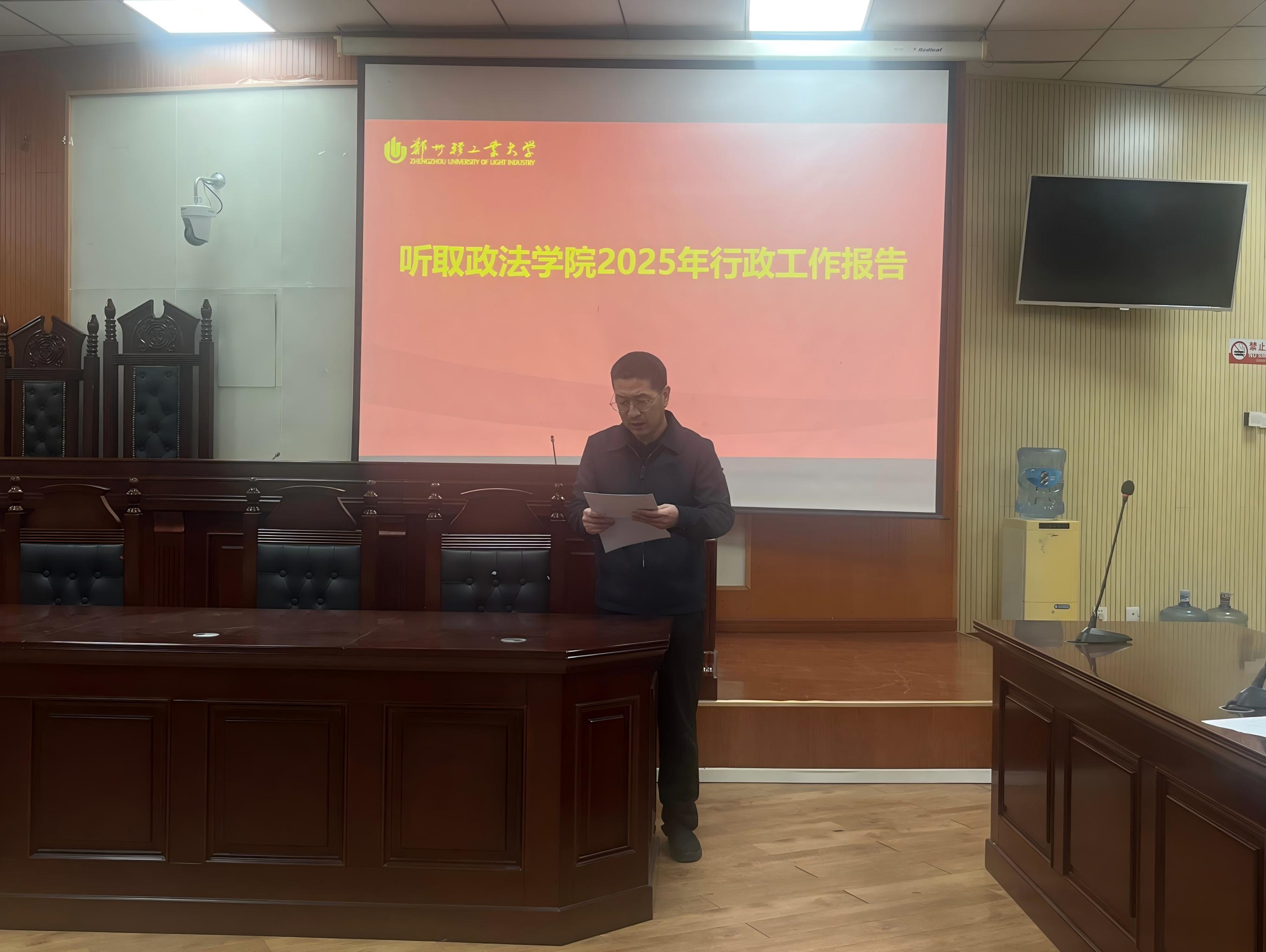 接着,代志明向大会作《政法学院2025年度工作报告》。报告从党建工作、教学工作、学科建设、科研工作、研究生教育、师资队伍建设、社会服务、学生工作等方面总结了学院一年来取得的各项成绩,分析了存在的问题和努力方向,提出了2026年的总体工作思路,并对重点工作进行了安排部署。工会主席孔朋向大会作了《政法学院工会2025年度工作报告》,工会委员孙靖珈向大会作了《政法学院工会2025年度经费使用情况报告》。与会教师认真审议并通过了学院工作报告、工会工作报告、工会财务报告。随后,与会教师以无记名投票方式对学院教工小家建设情况进行了民主测评。