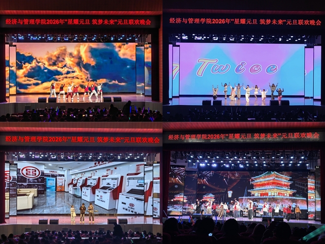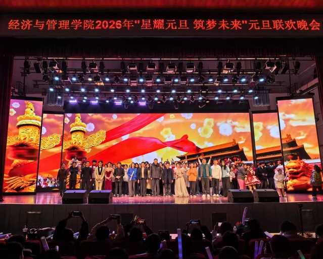 星耀元旦启新程,同心筑梦向未来。12月27日晚,经济与管理学院在东风校区大礼堂隆重举办2026年“星耀元旦 筑梦未来”元旦联欢晚会,学院领导、教职工与同学们欢聚一堂,共迎新年。现场洋溢着喜庆祥和、青春奋进的浓厚氛围。