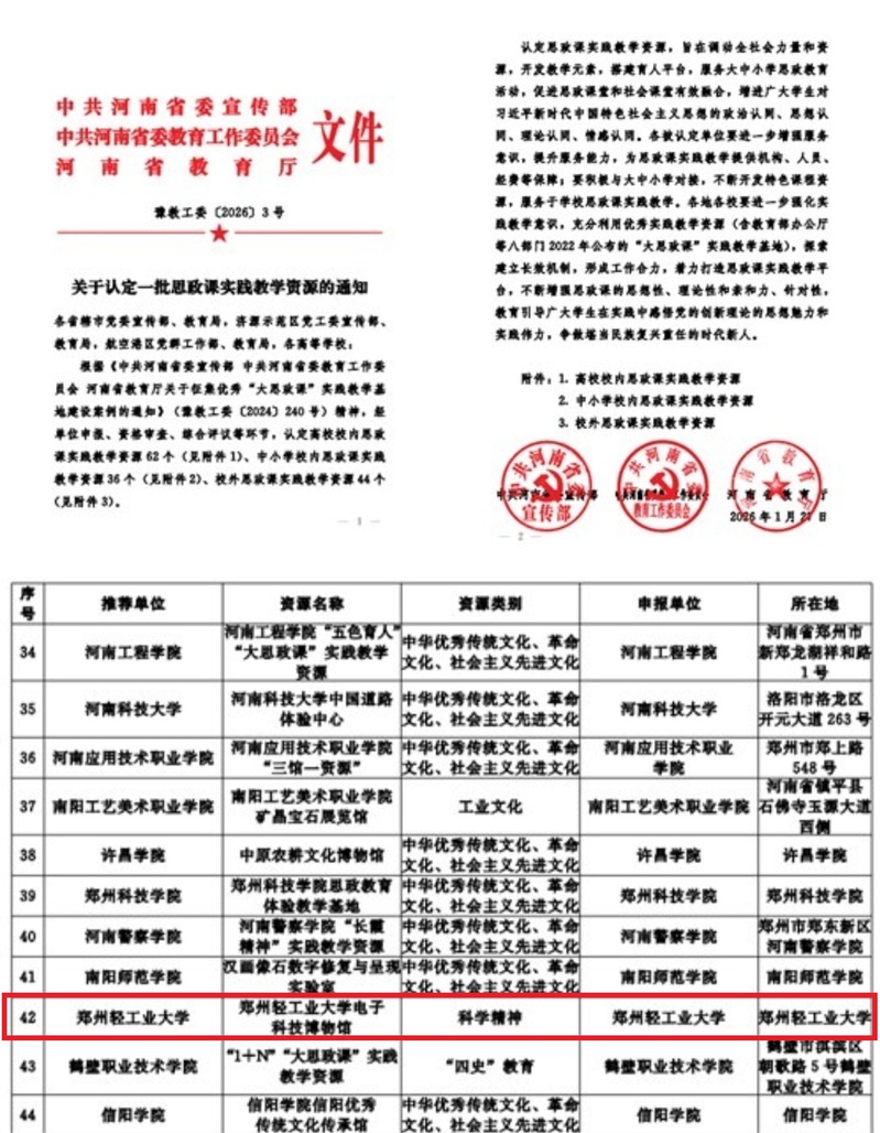 近日,中共河南省委宣传部、中共河南省委教育工作委员会、河南省教育厅联合印发《关于认定一批思政课实践教学资源的通知》(豫教工委〔2026〕3号),学校电子科技博物馆成功入选高校校内思政课实践教学资源名单。