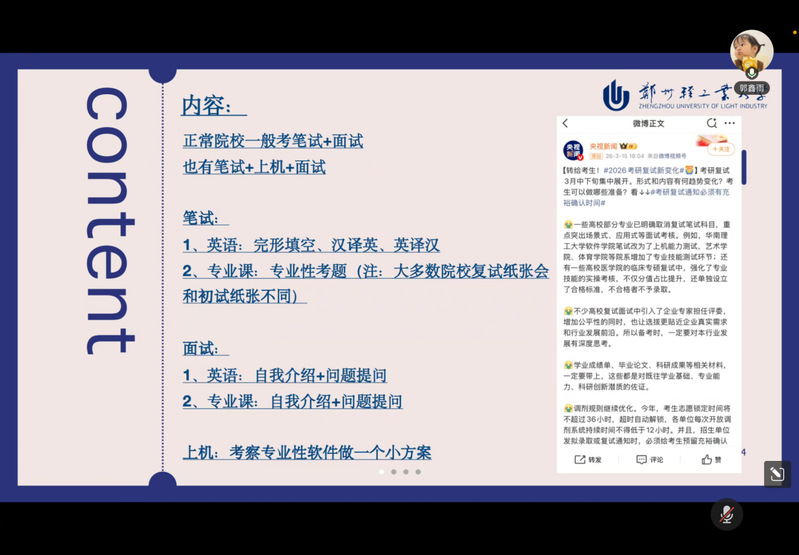 为扎实推进毕业生考研升学指导工作,全面提升学生复试竞争力,3月18日晚19时30分,艺术设计学院依托线上平台举办考研复试经验分享会。本次会议由毕业班辅导员周晓浩主持,特邀盛文艺术考研梁老师、考取广州美术学院视觉传达设计方向的2021级学生白润霓、考取本校数字媒体与动画方向的2021级学生郭鑫雨作专题分享。学院进入复试的大四学生及部分有意考研的学生参会交流。