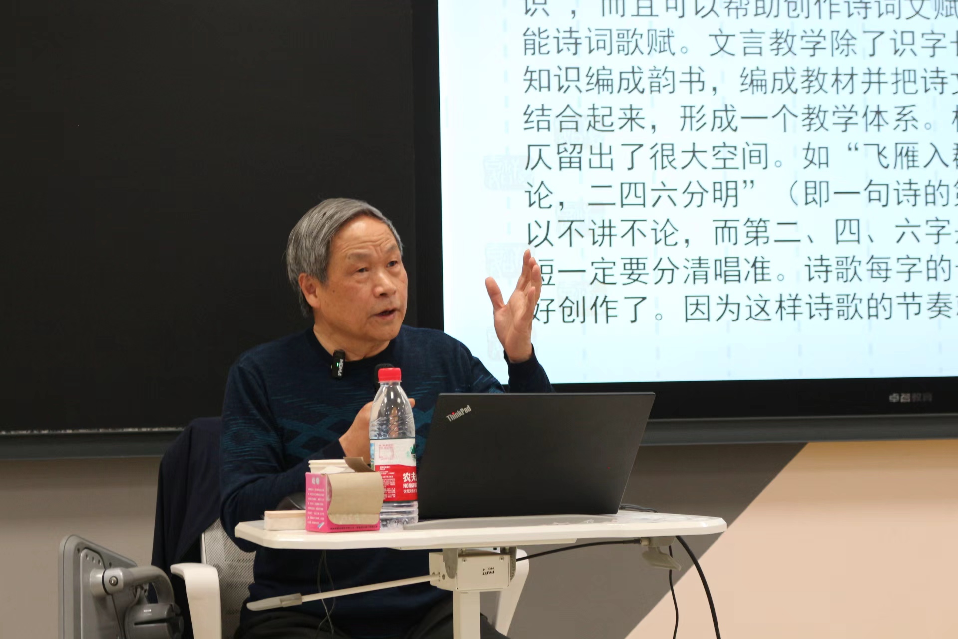 为弘扬中华优秀传统文化,应河南省吟诵学会和我校教职工读书协会邀请,中国语言文学教授、民俗学家、河南省吟诵学会名誉会长陈江风教授在东风校区教三楼智慧教室作《吟诵的分类与技巧》文化讲座。我校相关专业学生和部分教师参加讲座。讲座以现场讲解和线上直播的形式进行,吸引了800余名听众一起学习交流。