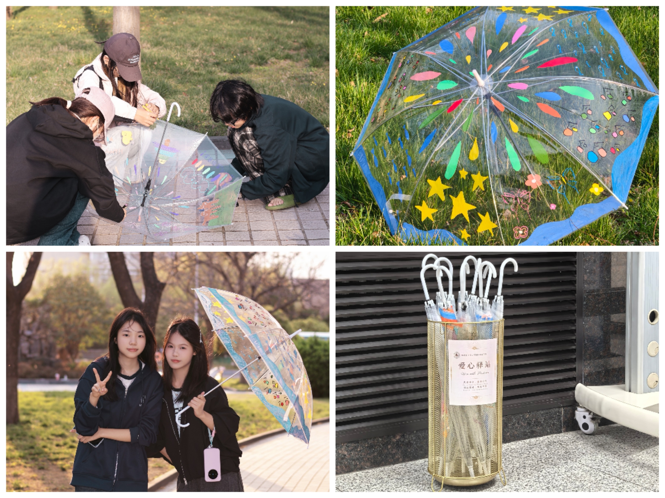 活动结束后,所有绘制完成的雨伞被悉心整理,放置在教二楼一楼指定位置,供师生雨天应急取用。这些承载着创意与温情的“心晴伞”,从个人的创作升华为共享的爱心资源,化作校园中随时可及的善意与暖意。一把把雨伞,不仅为突降的雨水遮出一片晴空,更将同学之间的关爱默默延续。